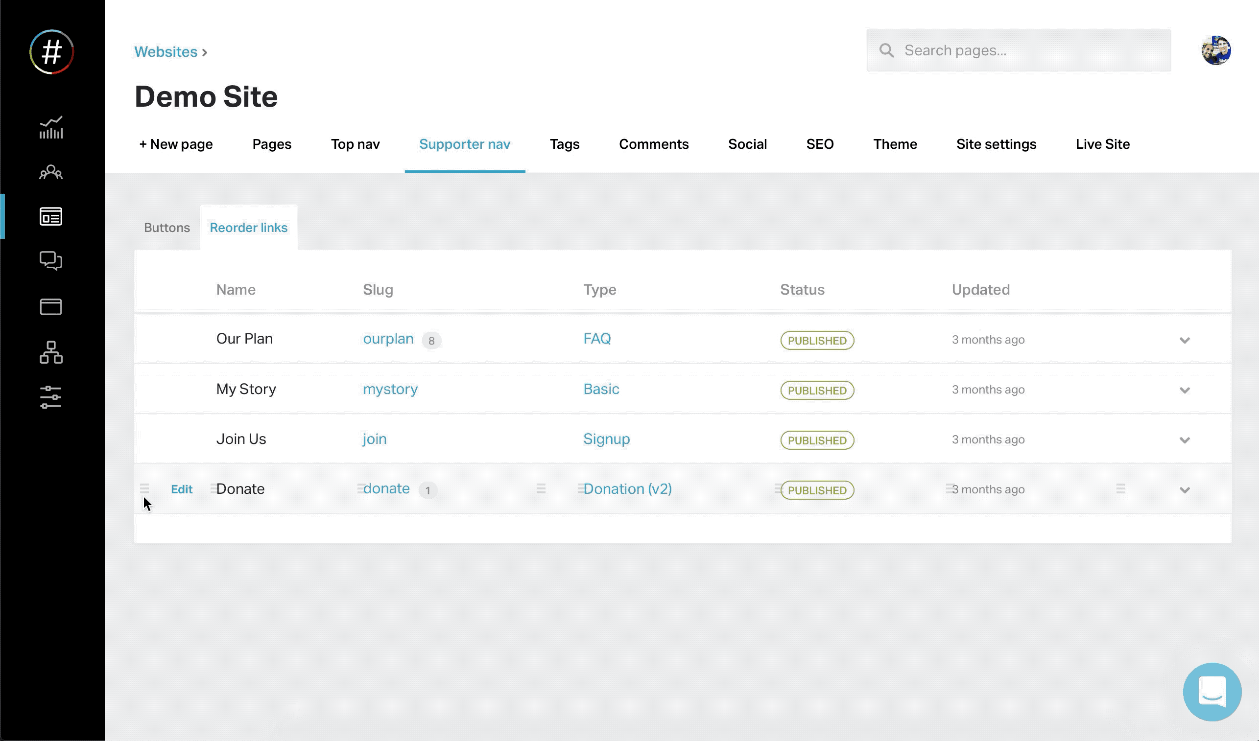 To change the order that your action buttons are displayed, under "Supporter nav" in your website's page list, click "Reorder links" and drag and drop them in your desired order.